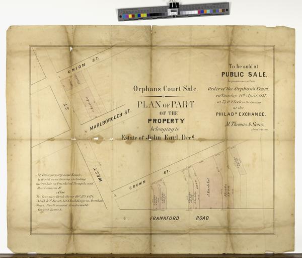 Text printed on recto: To be sold at public sale, in pursuance of an order of the Orphan’s Court, on Tuesday, 14th April, 1857, at 7 ½ o’clock in the evening at the Philada Exhange. M. Thomas & Sons, auctioneers. NB. Other property, same estate, to be sold same evening, including vacant lots on Frankford Turnpike and Shackamaxon St. Also two four story brick stores nos., 172 & 174, North 3rd Street; Lot & buildings in Marshall Street, 9 well secured irredeemable ground rents &c.