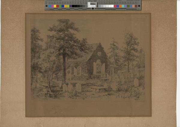 View depicting the Episcopal stone church (built 1715-1717) and surrounding cemetery on Valley Forge Road in Radnor and border of Wayne, Pa. Trees adorn the property lined by headstones.