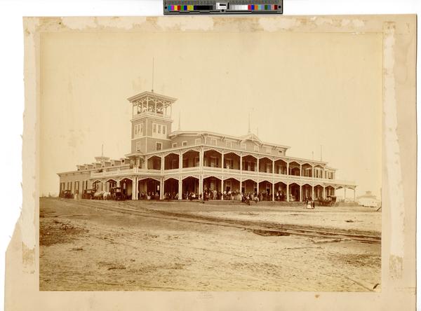 Exterior view of the New Excursion House, opened in 1869, and beachfront in Atlantic City, N.J. Shows the guests sitting, standing, and looking out from the three-story resort hotel with a watch tower and covered porches. In front of the house, men and women walk and four horse-drawn carriages are parked. Also shows in the foreground, the Camden and Atlantic Railroad Co. tracks extending across the grounds and to the hotel.