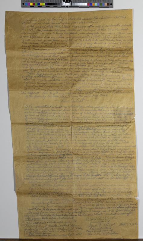 Text explicates that Wood’s grandfather, Alfred L. Wood, a carpenter, acquired the watercolors from an unknown source, either