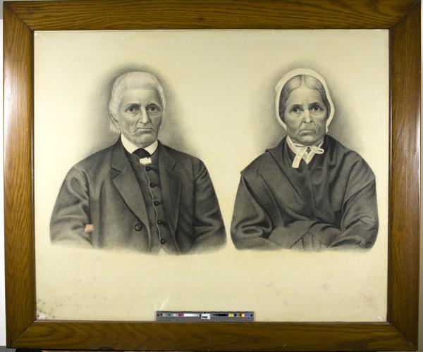 Shows possibly Quakers with the white man in the left and the white woman in the right. The man wears his white hair combed back and is attired in a white collared shirt, a black bowtie, waistcoat, and jacket. In the right, the woman wears her gray hair parted in the middle and is attired in a white bonnet tied under her chin and a black, long-sleeved dress with a shawl.