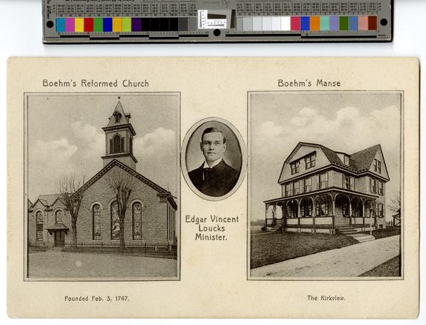 Postcard depicting a vignette portrait of the church’s minister Edgar Vincent Loucks between views of Boehm’s Church constructed in 1818 at 571 Penllyn Blue Bell Pike and the parsonage, Kirkview, in Blue Bell, Pa. In the left, shows the front façade of the stone church with stained glass windows and a spire. A wrought iron fence surrounds the building. In the center is a forward-facing portrait of Loucks, attired in spectacles, a white collared shirt, a tie, and a jacket. In the right is the three-story parsonage with a covered porch. The Church was founded by John Philip Boehm in 1740 and a building was erected in 1747 in Blue Bell, Pa. A new building was erected on the foundation of the older building in 1818. Extensive renovations, including the addition of the eighty-foot high spire with bell were completed in 1870.