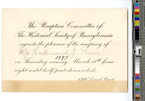 The Reception committee of the Historical Society of Pennsylvania requests the pleasure of the company of [Mr. Ferdinand J. Dreer] 1897 on Thursday evening, March 11th from eight until half-past eleven o’clock. 1300 Locust Street. [graphic].