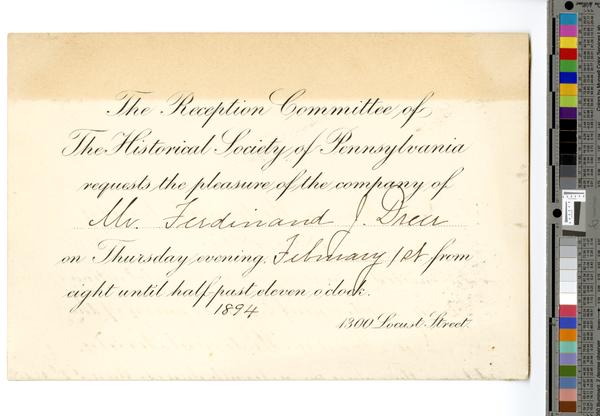 The Reception committee of the Historical Society of Pennsylvania requests the pleasure of the company of [Ferdinand J. Dreer] on Thursday evening, [February 1st] from eight until half-past eleven o’clock. 1894. 1300 Locust Street. [graphic].