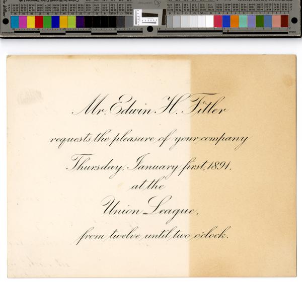 Mr. Edwin H. Fitler requests the pleasure of your company Thursday, January first, 1891, at the Union League, from twelve until two o’clock. [graphic].