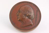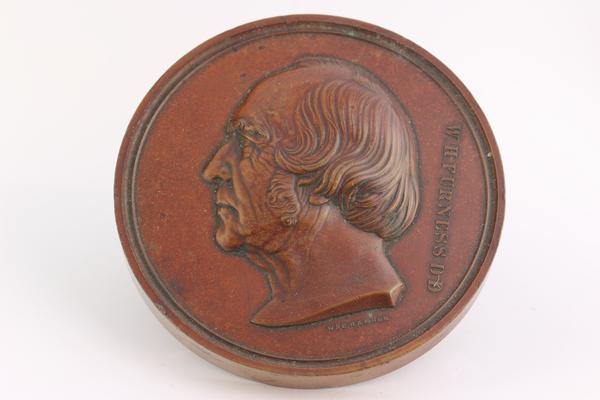 Bronze medal commemorating William H. Furness's fifty years as pastor of the First Unitarian Society in Philadelphia. Shows