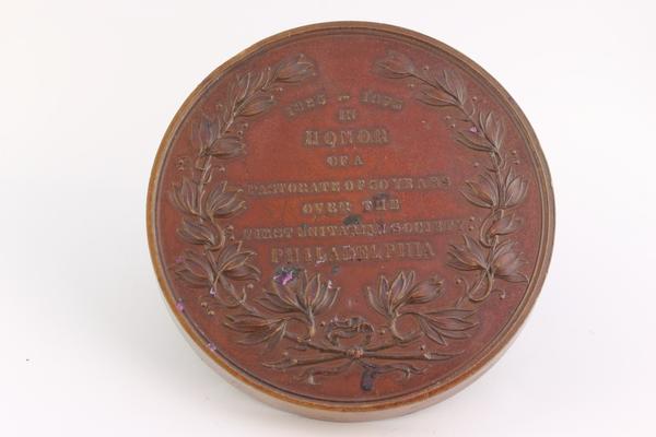 Bronze medal commemorating William H. Furness's fifty years as pastor of the First Unitarian Society in Philadelphia. Shows