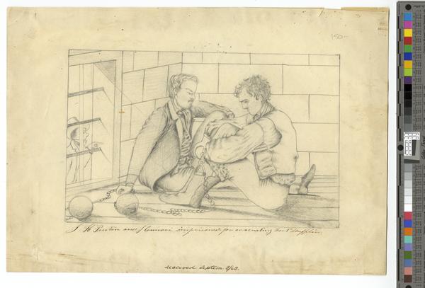 Pencil drawing showing two men, in a cinder-block cell, seated on the floor and with a ball and chain around one of each of their wrists. The man in the left, wears a mustache, and sits with his left knee bent and his right leg outstretched. He leans on his right hand to which the ball and chain are attached to that wrist. He wears a jacket, vest, cravat, pants, and shoes. The man in the right has very wavy hair, sits with his knees bent and his arms wrapped around them. His ball and chain is attached to his left wrist. He wears a flouncy-sleeved shirt, vest, breeches, and boots. In the left of the cell is a window with bars. A man, attired in a hat and coat, points and shouts through the bars.