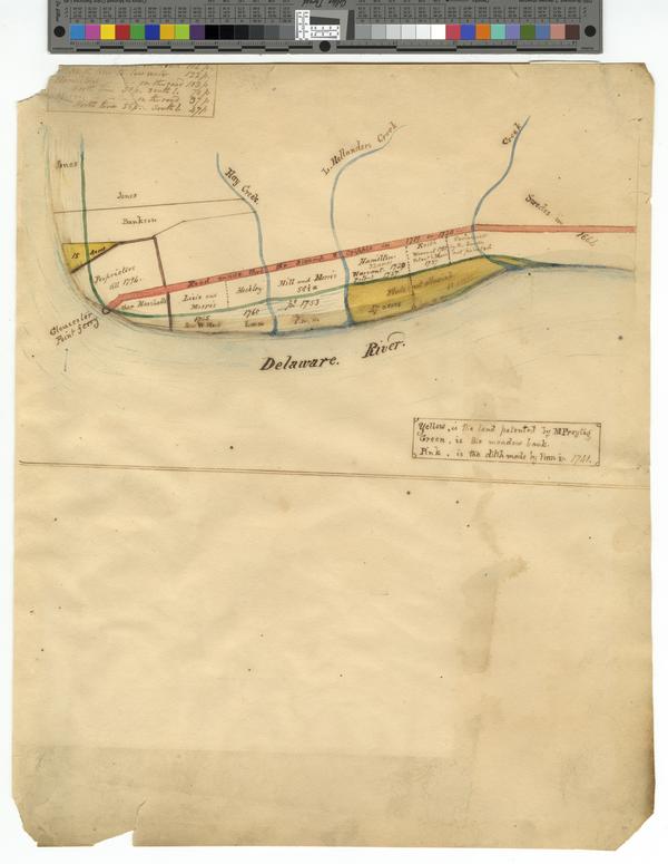 Includes key: Yellow is the land patented by M. Freytag/Green is the meadow bank/Pink is the ditch made by Penn in 1741.