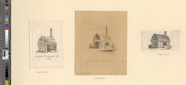 Series containing a pencil study, engraving, and wood-engraved periodical illustration of the stocking store that was razed circa 1832. Images show a wood-frame house with a large front window, outside cellar door, two stacked small side windows, and gambrel roof with chimney. The building is adorned with signage reading "Stockings. C & N. Jones." All of the graphics contain shading around the foot of the building. Ann Jones purportedly operated a stocking store from the same location during the 1750s.