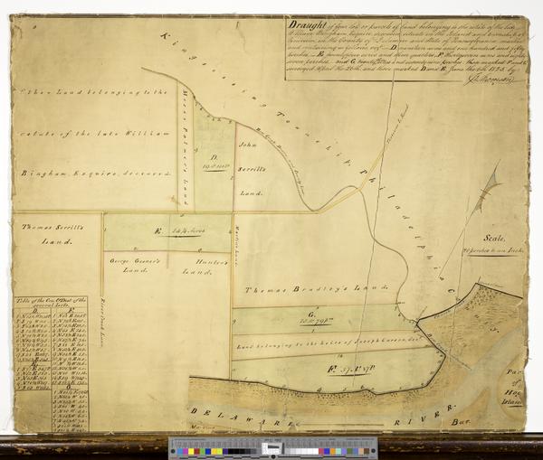 Draught of four lots or parcel of lands belonging to the estate of the late William Bingham, Esquire, deceased, situate in the island and township of Tinicum, in the county of Delaware and the state of Pennsylvania, marked and containing as follows, vizd._D. nineteen acres and one hundred and fifty perches_E, twenty four acres and three quarters,_ F, thirty seven acres and eighty seven perches, _ and G, twenty three acres and seventy nine perches: [cartographic material] / Those marked F and G surveyed April the 26th, and those marked D and E, June the 6th 1825 by Jno. Thomson.