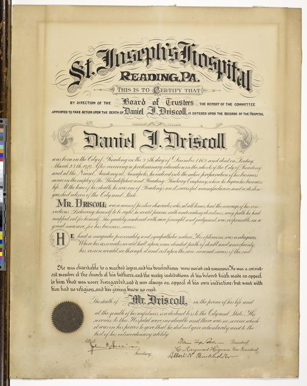 St. Joseph's Hospital, Reading, Pa. This is to Certify that by the direction of the Board of Trustees, the report of the committee appointed to take action upon the death of Daniel J. Driscoll is entered upon the records of the hospital. [graphic].