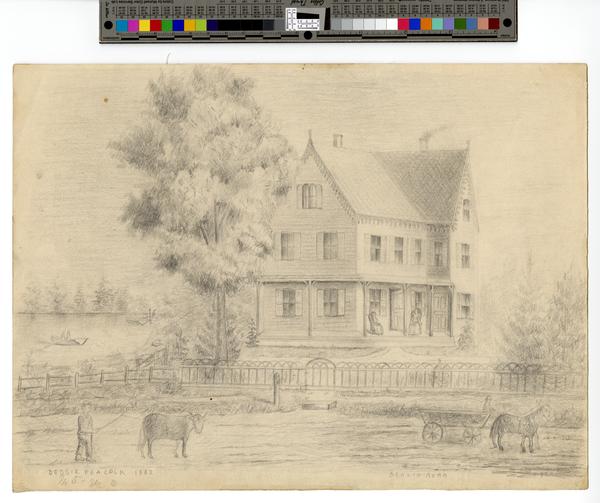 Pencil sketch of scene showing a horse-drawn cart and man shepherding a cow traveling on Berlin Road and in front of a three-story, Victorian-style residence. An ornamental fence lines the property. Two women sit on rockers on the porch and near the open front door of the residence. Trees adorn the property. In the left background, two men row a boat on a waterway.