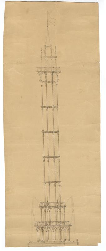 Architectural drawing showing a tower with arch details at the base and a spire adorned with a flag.