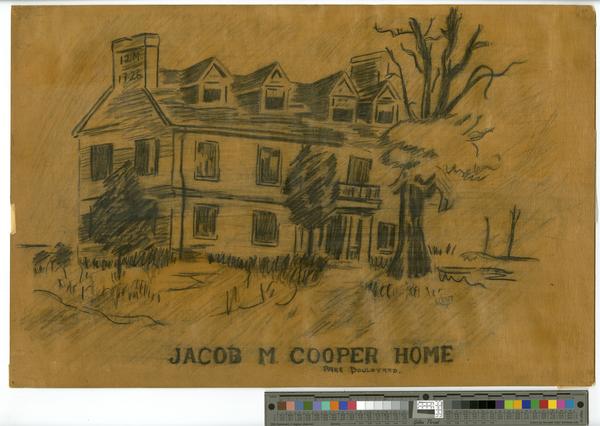 Pencil drawing showing the 18th-century Georgian residence, also known as Pomona Hall, originally built in the 1710s and expanded in 1726 and 1788 at Park Boulevard and Euclid Avenue in Camden, N.J. "12 M" and "1726" are written on a chimney on the left of the building. Trees line the front of the property. Erected by Quaker yeoman and slave owner Joseph Cooper, Jr., the residence was inherited by his nephew Marmaduke Cooper in 1767. The estate became the property of the Camden County Historical Society in 1924 following the sale of the building to the city in 1915.