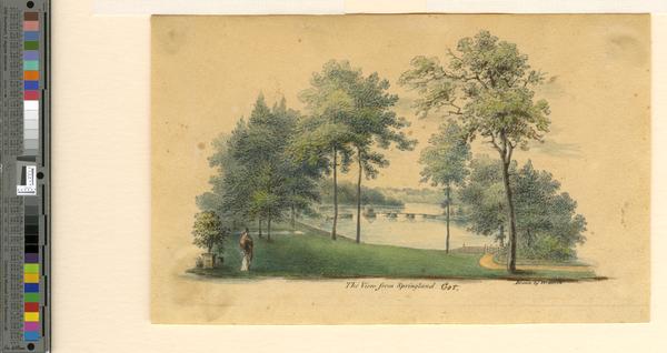 Depicts the Neshaminy Creek and lush grounds near William Birch's estate in Bucks County. View includes a woman standing near a potted tree, an abandoned bridge, and the abandoned toll house converted by Birch into his studio. Birch resided at the estate from 1798 to 1818. Birch sold the property in 1805, continue to dwell on the grounds, and repurchased the estate in 1813.