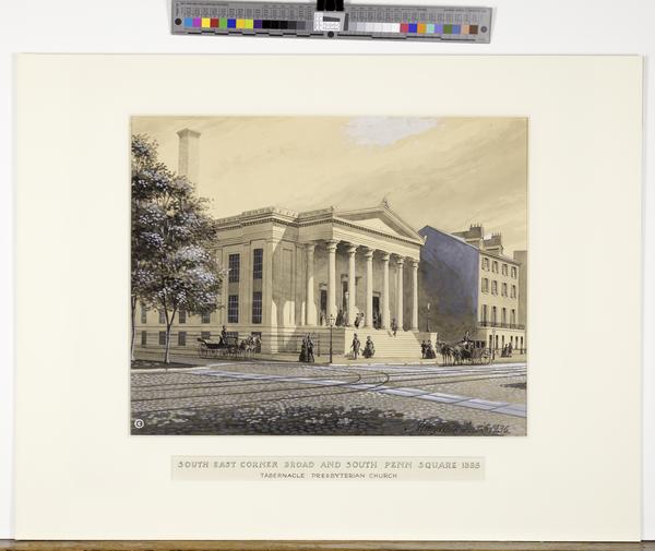 Exterior view of the Seventh Presbyterian Church built 1842 after the designs of Napoleon LeBrun at 1 South Broad Street, Philadelphia. Shows the front facade of the Greek Revival-style church with several steps leading to a portico. Numerous pedestrians walk in front of and around the church, and horse-drawn carriages travel down the streets. Also shows an adjacent building in the right and a tree at the street corner in the left.