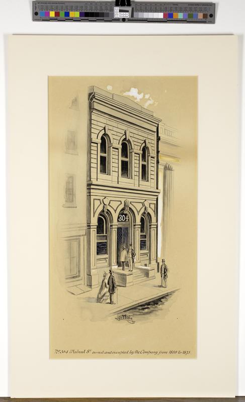 Watercolor of the front façade of the Pennsylvania Company for Insurances on Lives and Granting Annuities’ office building constructed in 1859 at 304 Walnut Street, Philadelphia. Shows the two-story building with a sign above the front entrance that reads, “304.” Signs in windows to the left and right of the entrance advertise the Company’s name. Two men stand on the front steps and converse, and several pedestrians walk on the sidewalk. Also shows partial views of adjacent buildings. The Pennsylvania Company for Insurances on Lives and Granting Annuities was founded in 1812. In 1872, it was renamed as the Pennsylvania Company for Banking and Trust. The firm merged with the Bank of North America and Trust Company in 1929. The Company occupied the building at 304 Walnut Street, Philadelphia from 1859 to 1873.