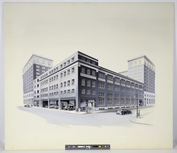 Drawing, possibly for an advertisement, of an exterior view depicting the rear of the multi-story complex of the Curtis Publishing Company Building built after the designs of Edgar Seeler in 1911. Shows a line of cars and trucks parked in the garage. Workers move a pallet onto a delivery truck. Pedestrians walk on the sidewalks around the building, and cars travel down the street. In the right is a street light with street signs for “7th St.” and “Sansom St.” The firm occupied a city block between 6th and 7th and Walnut and Sansom Streets and included four structures: publication building; convenience belt; manufacturing building; and power building.