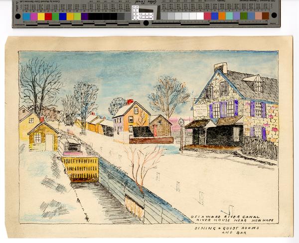 Drawing depicting the Delaware River canal in New Hope, Pa. Shows a canal boat with an American flag traveling down the Delaware River canal. Buildings flank the canal, including the two-and-a-half-story River House Bar. Snow covers the ground.