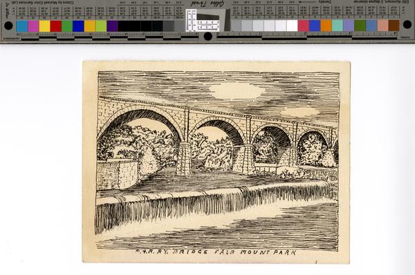 Drawing depicting the Philadelphia & Reading Railroad bridge, also known as the Wissahickon Creek Viaduct or High Stone Bridge, which began construction in 1874 and was completed in 1882. Shows the waterfall of the Wissahickon Creek flowing in the foreground. The stone arched bridge spans across the water. Trees are visible in the background.
