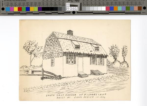 Drawing depicting an exterior view of the house originally built by John Dedier in 1773 on Fisher's Lane, Germantown, Pa. Shows an oblique view of the entrance with two steps leading to the front door. The hip-roofed house has two dormers, a chimney, and shuttered windows. In the left is a wooden fence. Several trees are visible in the background.