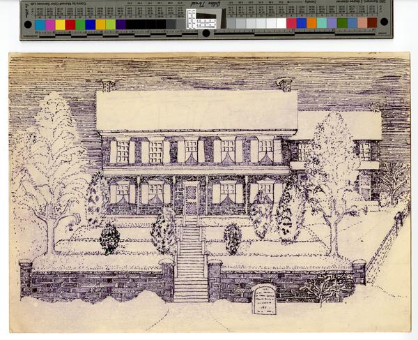 Drawing depicting an exterior view of an unidentified residence. Shows the front facade of the two-story, brick house. A long series of stairs leads from the yard to the front door. The house has chimneys, shuttered windows, and an additional wing in the right. Trees and shrubs grow on the grounds. A stone plaque with writing is in front of the brick wall, which surrounds the property.
