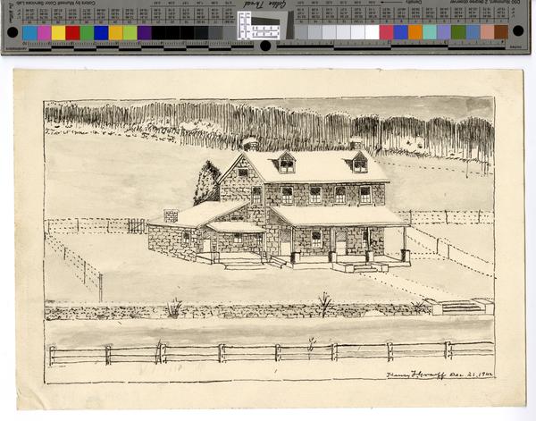 Drawing depicting an exterior view of an unidentified residence. Shows the front facade of the two-and-a-half story, brick house. Stairs lead to the front door. The house has a covered porch, dormers, and two chimneys. There is a wing in the left, which has a separate covered porch and front door. A stone wall borders the front of the property and fences divide the sides and back.