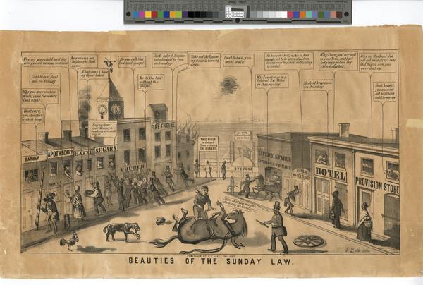 Cartoon mocking Philadelphia's Sunday Law depicting an absurd street scene where citizens are barred from patronizing several closed businesses and public facilities, except for church. Renewed enforcement of the unpopular law proceeded the election of Sabbatarian Mayor Robert T. Conrad in 1854. Police patrol the street enforcing the law, including preventing a downed horse from dying; a "segars" store chimney from "smoking"; and a mourner from hiring a carriage to travel to a funeral "20 miles away." Other citizens angrily mob the church and plead to patronize the businesses and public services, including: a mother unable to purchase medicine from an "Apothecary" for her sick child; a fire victim unable to request a fire engine; a man with a "bellyache" prevented from using a locked "Public Water Closet"; and a wife barred from purchasing provisions as a result of her husband's tardily received wages. Also contains: a clock, a dog, and a rooster padlocked to prevent them from making noise. In the background, the steamship John "Stevens" remains docked at the pier near signs stating, "This river is stopped from running on Sundays" and "No fish allowed to swim on Sunday."