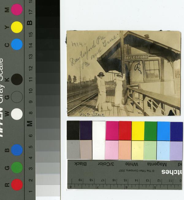 Two smiling women, a suitcase at their feet, stand on a wooden train platform next to a small station identified with a sign as Daylesford. In the center, two white women, attired in brimmed hats, gloves, jackets, and skirts, look at the viewer. Empty train tracks stretch out behind them. Built as part of the Pennsylvania Railroad, the station, razed in 2000, was located on Lincoln Highway and Conestoga Street, 18 miles west of Philadelphia.