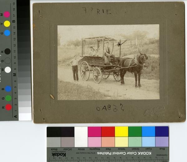 Shows Bunch the horse harnessed to a wagon on a dirt road. A young man, attired in a collared shirt with the sleeves rolled up, suspenders, tie, pants, and boots, is seated in the driver's seat and holds the reins. Three children sit in the vehicle and look at the viewer. Another man, attired in a collared shirt with the sleeves rolled up, suspenders, pants, and boots, stands next to the wagon with his left hand holding the side of the vehicle.