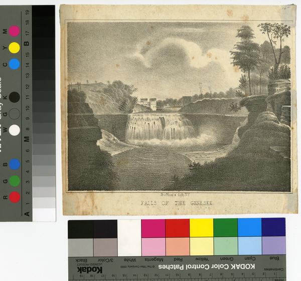 View depicting the large waterfall of the Genesee River at Rochester, New York. In the center, shows the water rushing down the hill and towards the viewer. Cliffs jut out in the left and in the right. In the background, several buildings are visible.