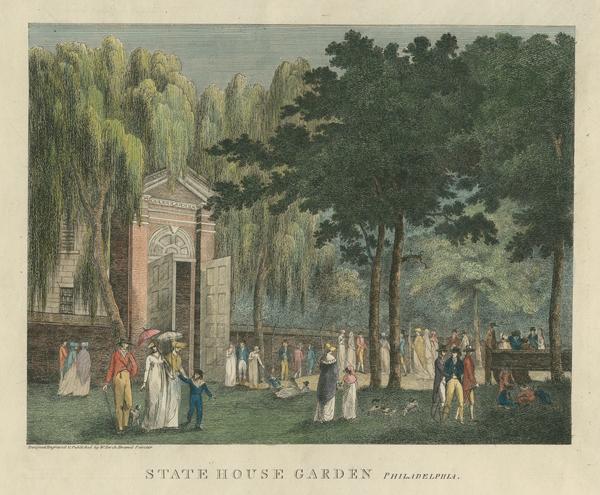 View showing the well-patronized garden at the rear of the State House on Walnut Street, enclosed by a brick wall and a tall gateway with wooden doors. Depicts several individuals at leisure, walking, sitting on a bench, and conversing on the landscaped grounds. The grounds purchased in 1760, enclosed in 1770 (the gate given by legislator and State House trustee Joseph Fox), was landscaped with trees and promenades under the direction of visiting Jamaican trader and American Philosophical Society member Samuel Vaughan around 1784.