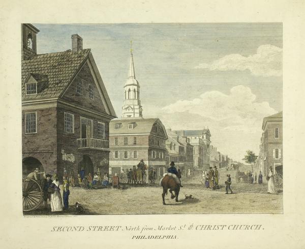 Street scene showing Second Street north from Market Street in Philadelphia, including Christ Church and the Old Courthouse