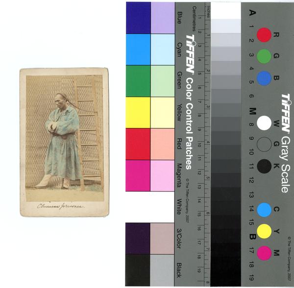 Full-length portrait of an unidentified Chinese man with his queue tied to a ladder. The man, wearing a queue hairstyle and attired in a blue robe, belt, and cloth slip-on shoes, stands facing to the left with his hands inside his sleeves at his waist and his right foot forward. His hair is tied to a ladder that leans against the wall in the right. The manuscript inscription labels the man as a "Chinese prisoner."