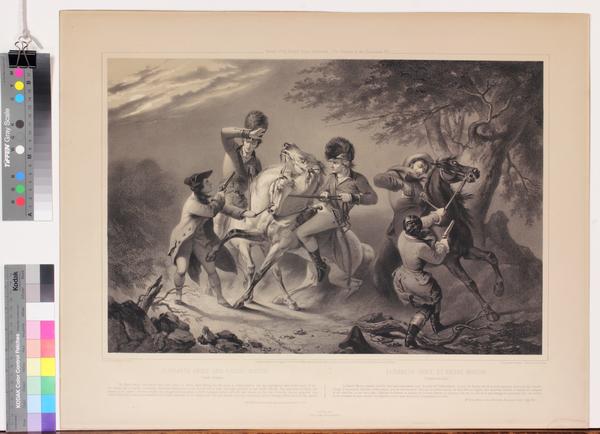 Genre print illustrating an account from Elizabeth F. Ellet's 1848 book that honored the Revolutionary wartime experiences of 150 women. Depicts the tale of southern sister-in-laws Elizabeth Grace and Rachel Martin and their successful interception of a British dispatch while disguised in their husband's clothing. On a rugged dirt path, the Martin women hold pistols and the reigns of two of the three agitated horses that carry the soldiers and the plain-clothed messenger. The messenger clutches the dispatch to his chest and the soldiers look in disdain and surprise. Also contains several lines of text in English and French below the image explicating the scene as well as citing the source "(Mrs. Ellet, the Women of American Revolution, vol. 1. P. 274.)".