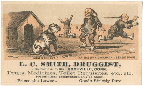 Trade card promoting druggist Louis C. Smith and depicting racist caricatures of Chinese men being attacked by dogs. In the left foreground, shows a large dog chained to a doghouse. The Chinese man, wearing a queue hairstyle, a blue tunic and pants, and white, slip-on shoes, looks at the dog in fear. In the right, a Chinese man runs away with his queue flying behind him. In the background, a Chinese man, his back to the viewer, screams and raises both arms up as a white dog bites his bottom. Text written in pidgin English below the image: What d’yer soy? Ha! Ha! John Chinaman he eatie doggie.
