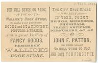 Advertising text printed on verso: You will never go amiss, if you go to Wallick’s Book Store, to make your purchases, books