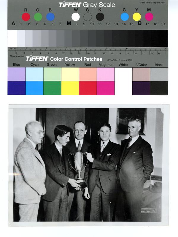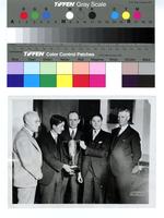 Group portrait photograph showing Japanese ambassador to the United States Hiroshi Saitō receiving an award from representatives