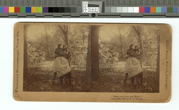Racist stereograph of an outdoor caricatured, genre scene showing an African American man woman couple seated together on a tree swing in a clearing in the woods. The woman sits on the lap of the man. Her left leg dangles. Her right cheek rests against his left one. She smiles and looks out. His eyes are turned toward hers. The woman wears a patterned, dark-colored shirtwaist, a floral-patterned skirt, dark stockings, and boots. He wears a suit. Scene also includes leaves on the ground and trees and bushes in the background.