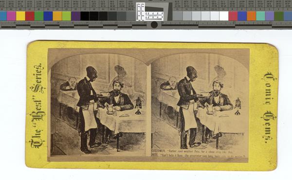 Reproduction of a drawing of a racist, comic scene showing an African American waiter serving a bearded, white man seated at a restaurant table. The African American waiter is depicted with exaggerated features, including an oblong-shaped head. He wears a black suit, a white shirt with a high collar, and an apron around his waist. The waiter stands beside the table that is covered in a tablecloth. He rests his left hand on it and holds a bowl of soup on a saucer in his right. The customer, attired in a tuxedo, rests his left arm near a pitcher, glass, napkin and condiment display on the table. In the background, a bald man, sits and eats at a nearby table. Paneling adorns the walls of the restaurant on which the morphed shadow of the waiter is visible.