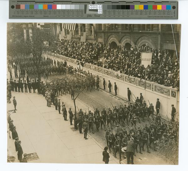 Photograph depicting soldiers of the 28th Division of the Army marching past Independence Hall at 520 Chestnut Street, Philadelphia at the homecoming parade on May 15, 1919. Shows the soldiers carrying rifles and marching in formation down the street. In the right, spectators sit in bleachers and watch the parade. A banner on the post of the bleachers reads, "Boureuilles." American and Allied flags, including a Japanese flag, decorate the buildings. Police officers stand flanking the parade route. A photographer takes photographs standing on a stone urn on the sidewalk in the left. The 28th Infantry Division represents the Pennsylvania National Guard and was also called the "Iron Division" and “Keystone Division.” The Division served in World War I, including at the Battle of Chateau-Thierry.