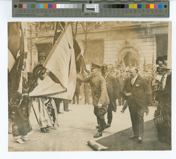 Photograph depicting General John J. Pershing greeting women dressed as Allied nations at Independence Hall during the General's visit to Philadelphia on September 12, 1919. Shows Pershing, attired in uniform, smiling with his left hand out as he greets the women representing the Allied nations standing in the left. The women each hold large national flags on flagpoles. A woman, dressed as Britannia in a helmet and Union Jack dress, smiles at the General. In the left, partially obscured by a flag, is a woman attired in a floral print kimono representing Japan, who holds a Japanese flag. Mayor Thomas Smith walks behind the General holding his top hat in his right hand. Police officers stand in front of a crowd of spectators. General John Joseph Pershing (1860-1948) served as the commander of the American Expeditionary Forces (AEF) during World War One from 1917 to 1920. His visit to Philadelphia on September 12, 1919, included a parade, receiving a medal, planting a memorial tree, presenting colors to cadets at Wanamaker's store, visiting Independence Hall, and a speech at the Union League. Thomas B. Smith was the Mayor of Philadelphia from 1916 until 1920.