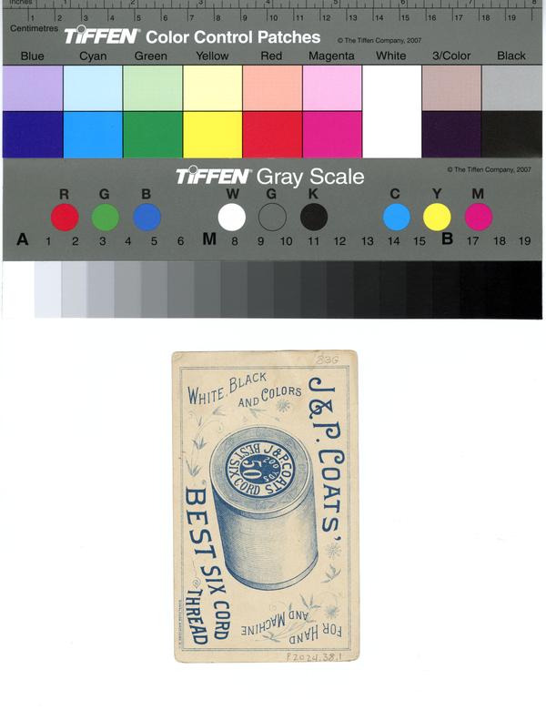 Advertising text printed on verso: White, black and colors for hand and machine. J & P. Coats' Best Six Cord Thread. |