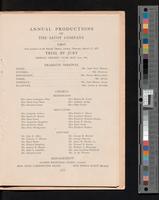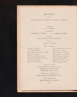 Program for performance of The Mikado or, The town of Titipu, the opera by W. S. Gilbert and Arthur Sullivan at the Broad Street Theatre, Philadelphia from May 14 to 17, 1913 for the benefit of Philadelphia Lying-In Charity Hospital. Includes a list of the Savoy Company's previous performances from 1901; history of the Savoy Company; article on Gilbert and Sullivan's operas; list of members of the Savoy Company; cast of performers of the Mikado; article on the Philadelphia Lying-In Charity Hospital; and cast of performers of every previous Savoy Company production. Cover image by artist Franz de Merlier and depicts the Mikado, or Emperior standing attired in a red hat and patterned kimono. In the right, a Japanese man, wearing a chonmage hairstyle and red kimono, sits on the floor. A line of four men, wearing chonmage hairstyles and patterned kimonos, hold swords in their right hands.