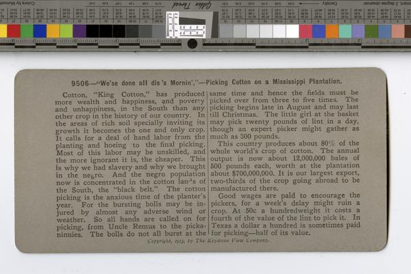 Variant title on verso: 9506-"We'se done all dis's mornin',"-Picking cotton on a Mississippi plantation. |