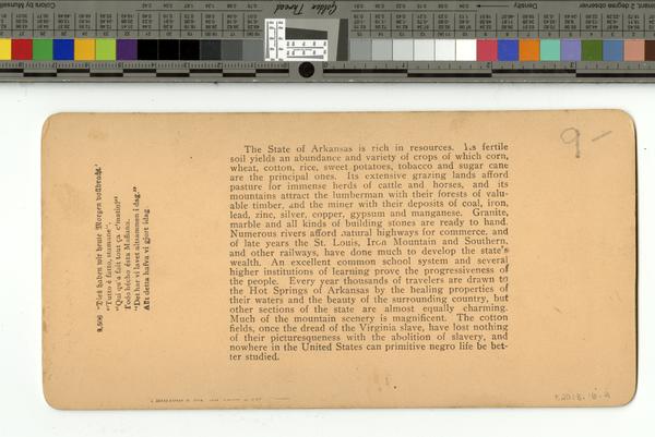 Several lines of text printed on verso about the "rich resources" of the state of Arkansas, including fertile soil for a "variety