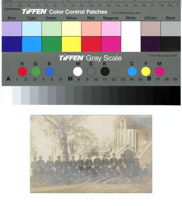 Shows the boy residents attired in military-like uniforms, some posed with rifles, standing and seated, in rows by age and
