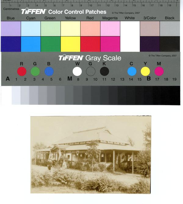 Exterior view of the Formosa Tea House at the Sesquicentennial Exposition in Philadelphia held from May to November, 1926. Shows the front facade of the Japanese-style building. An American and a Japanese flag flank the front door and side entrance in the right. Paper lanterns and an additional Japanese flag hang from the open windows of the porch in the right. Women attendees walk around the Tea House. The Formosa Tea House was one of three buildings in the Japanese Garden. The Sesquicentennial Exposition, situated near the Navy Yard, celebrated the 150th anniversary of the signing of the Declaration of Independence through attractions and entertainment in the form of pageants, exhibitions, and sporting events. Japan annexed Formosa (ie. the island of Taiwan) in 1895 and remained in control until 1945.