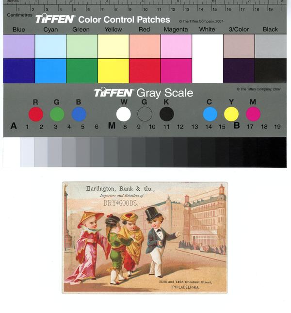 Trade card promoting dry goods store Darlington, Runk & Co. and depicting a white man walking with an Asian, Spanish, and Arab man. Shows a white man, attired in a black top hat, a white collared shirt, black bowtie, black jacket, and white pants, walking and leading three men with his arms out. The three men are in cultural attire, including an Asian man, wearing a conical hat and a pink robe with buttons down the front and a white and gold collar and gold trim; a Spanish man, wearing a green and gold matador Traje de luces; and probably an Arab man, wearing a red and gold turban, gold shawl, and and red pants. In the background are large buildings lining a city street and heavy pedestrian traffic on the sidewalk. Joseph G. Darlington (1842-1908) and William M. Runk founded Darlington, Runk & Co. in 1874. After Runk's death in 1893, the firm changed to Joseph G. Darlington & Co.